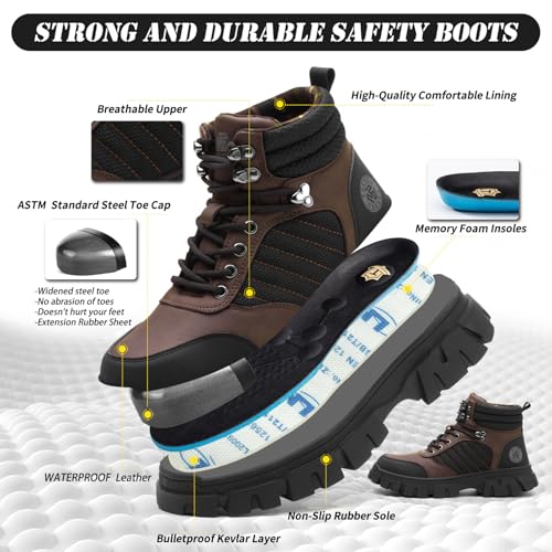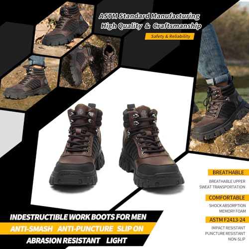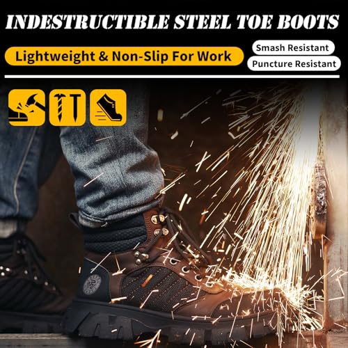 KELODON Waterproof Steel Toe Boots For Men-6 Inch Comfortable Mens Safety Work Boots Indestructible Steel Toe Shoes Lightweight Non Slip Puncture Resistant Industrial Construction Boot